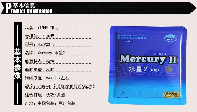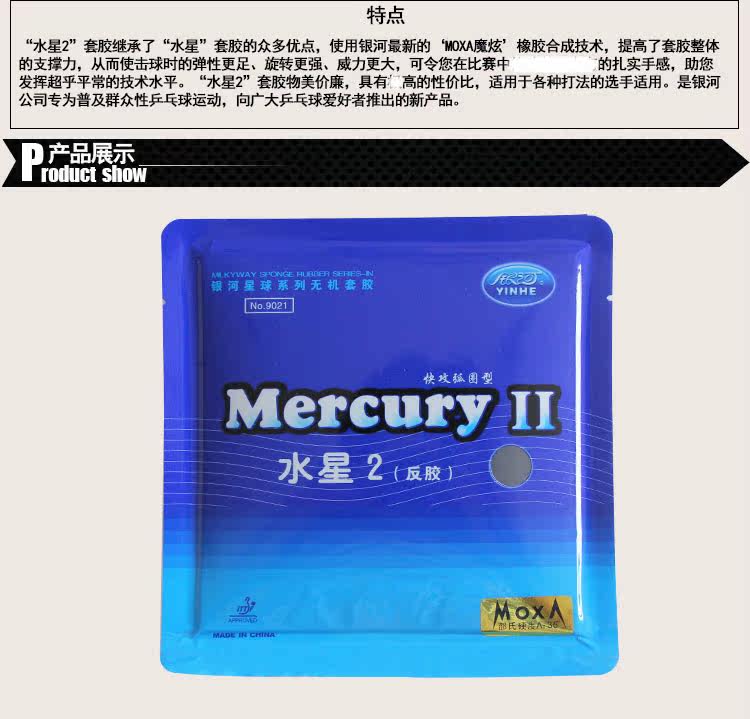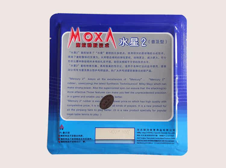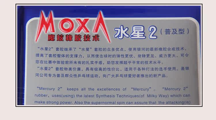 “水星2”套胶继承了“水星”套胶的众多优点,使用银河最新的‘MOXA魔炫’橡胶合成技术,提高了套胶整体的支撑力,从而使击球时的弹性更足、旋转更强、威力更大,可令您在比赛中体验前所未有的扎实手感,助您发挥超乎平常的技术水平。